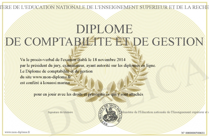 Envoyez par email votre Diplôme de comptabilité et de gestion personalisé