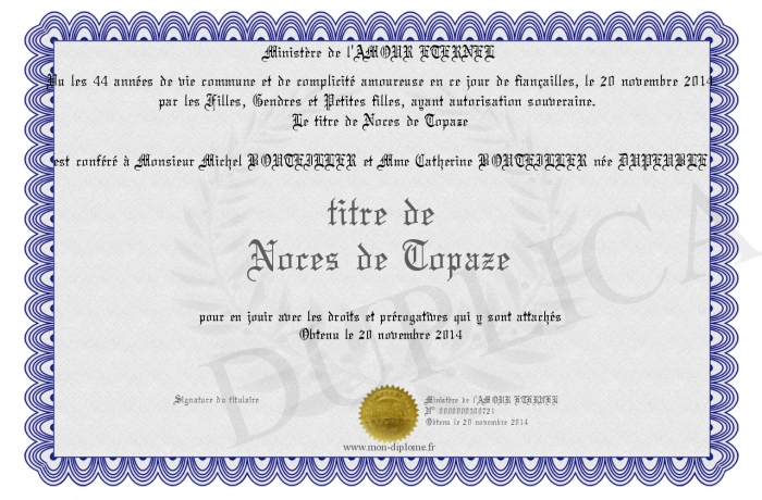 Envoyez par email votre titre de Noces de Topaze personalisé
