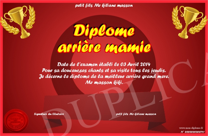 Envoyez par email votre Diplôme arrière mamie personalisé