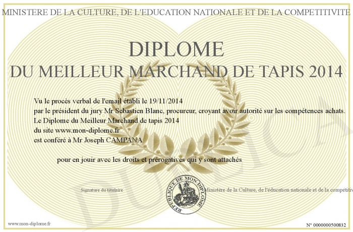 Envoyez par email votre Diplôme du Meilleur Marchand de tapis 2014 personalisé