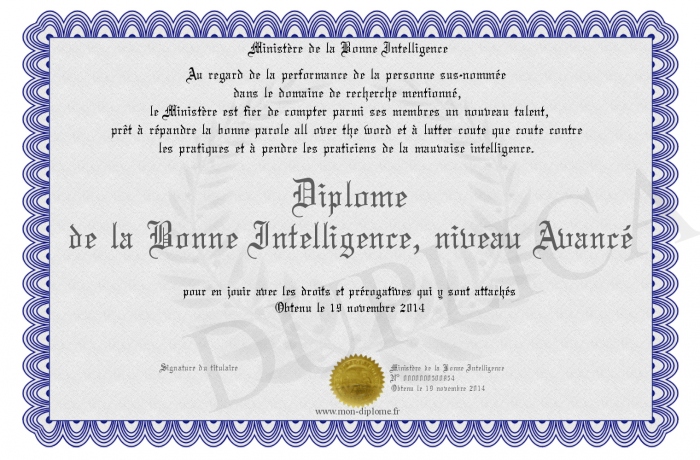 Envoyez par email votre Diplôme de la Bonne Intelligence, niveau Avancé personalisé