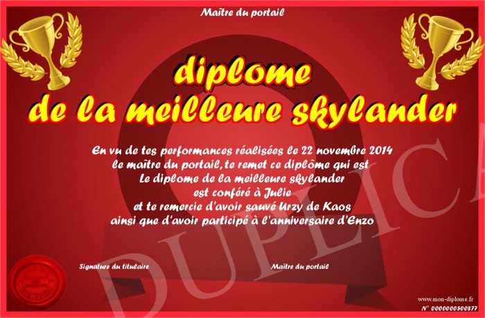 Envoyez par email votre diplome de la meilleure skylander personalisé