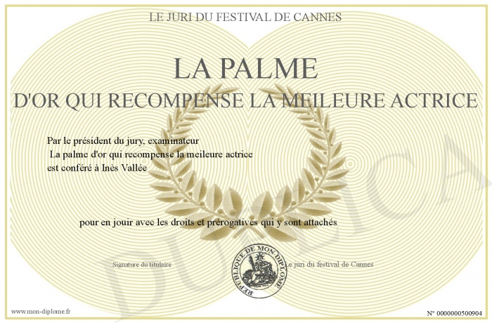 Envoyez par email votre La palme d'or qui recompense la meileure actrice personalisé