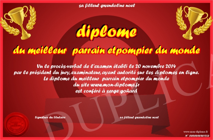 Envoyez par email votre diplome du meilleur parrain etpompier du monde personalisé