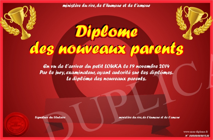 Envoyez par email votre Diplôme des nouveaux parents personalisé