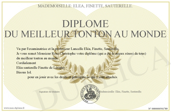 Envoyez par email votre Diplôme du meilleur tonton au monde personalisé