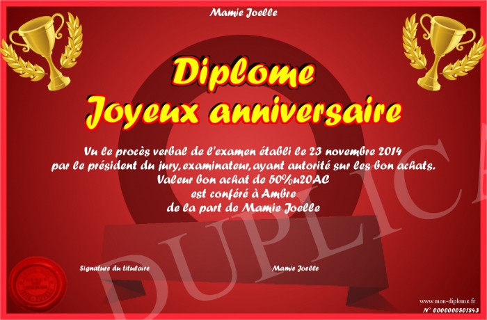 Envoyez par email votre Diplome Joyeux anniversaire personalisé