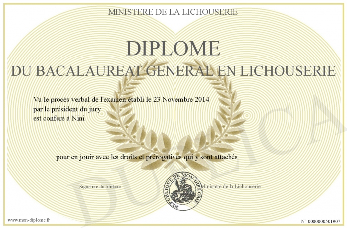 Envoyez par email votre Diplôme du bacalaureat général en lichouserie personalisé