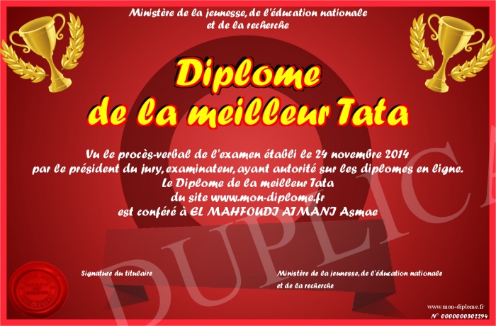 Envoyez par email votre Diplôme de la meilleur Tata personalisé
