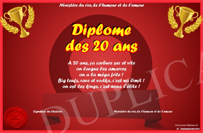 Envoyez par email votre Diplôme des 20 ans personalisé