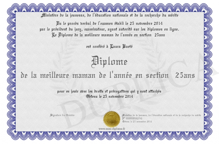 Envoyez par email votre Diplôme de la meilleure maman de l'année en section 25ans personalisé