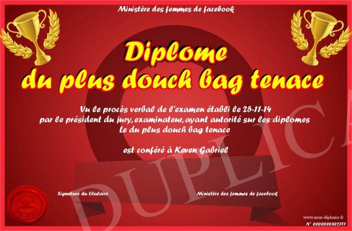 Envoyez par email votre Diplôme du plus douch bag tenace personalisé