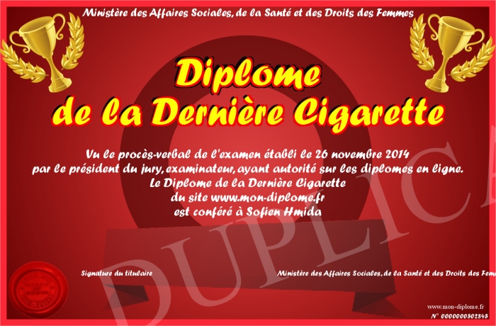 Envoyez par email votre Diplôme de la Dernière Cigarette personalisé