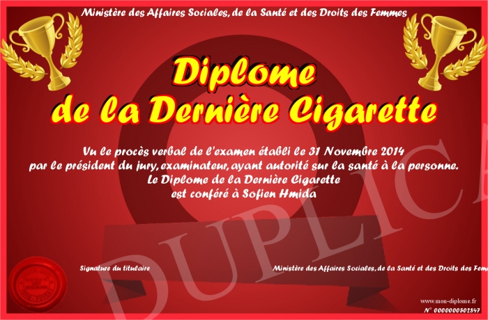 Envoyez par email votre Diplôme de la Dernière Cigarette personalisé