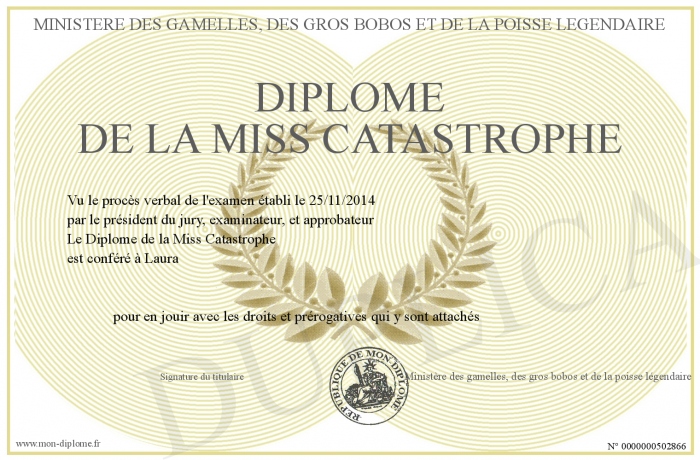 Envoyez par email votre Diplôme de la Miss Catastrophe personalisé