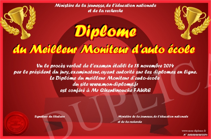 Envoyez par email votre Diplôme du Meilleur Moniteur d'auto école personalisé