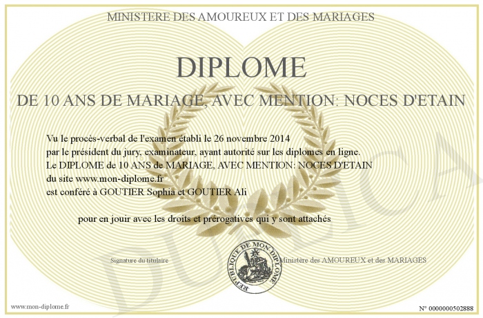 Envoyez par email votre DIPLOME de 10 ANS de MARIAGE, AVEC MENTION: NOCES D'ETAIN personalisé