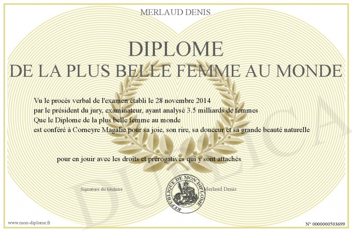 Envoyez par email votre Diplôme de la plus belle femme au monde personalisé