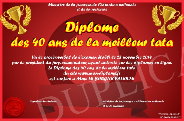 Envoyez par email votre Diplôme des 40 ans de la meilleur tata personalisé
