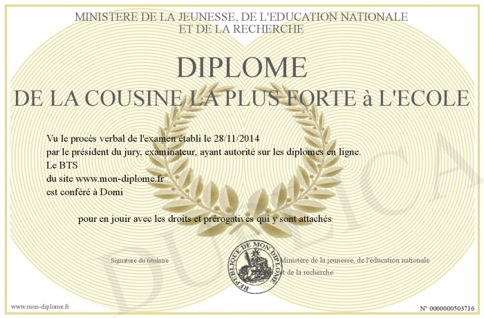 Envoyez par email votre Diplôme de la cousine la plus forte à l'école personalisé
