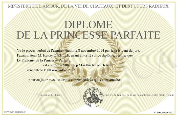 Envoyez par email votre Diplôme de la Princesse Parfaite personalisé