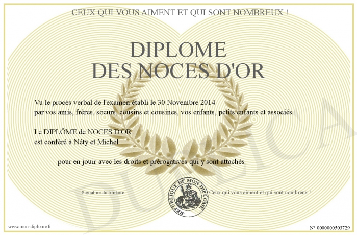 Envoyez par email votre Diplome des Noces d'Or personalisé