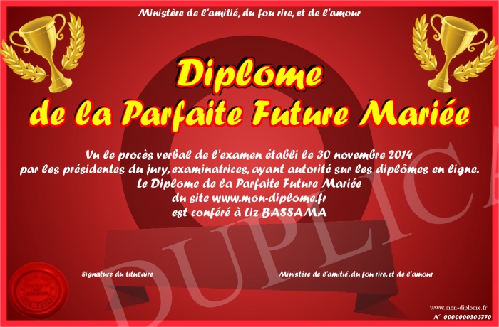 Envoyez par email votre Diplôme de la Parfaite Future Mariée personalisé