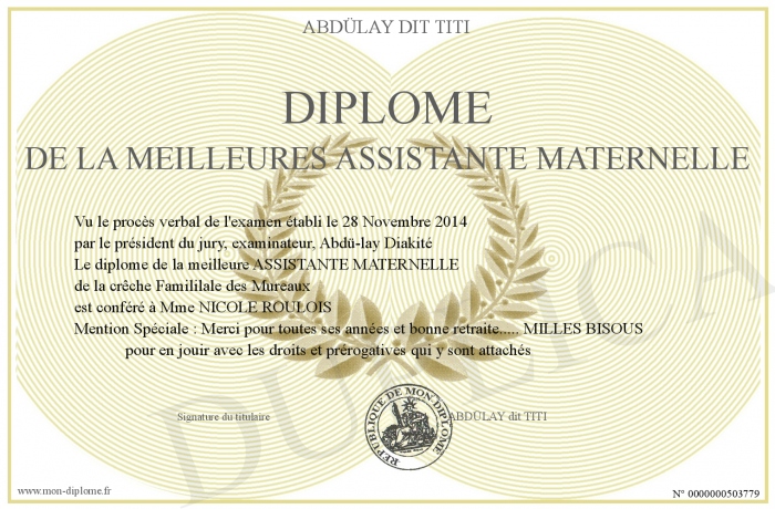 Envoyez par email votre DIPLOME de la meilleures Assistante Maternelle personalisé