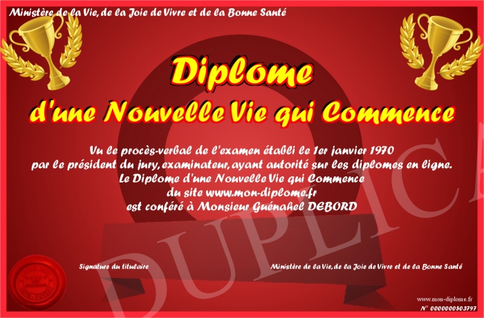 Envoyez par email votre Diplôme d'une Nouvelle Vie qui Commence personalisé