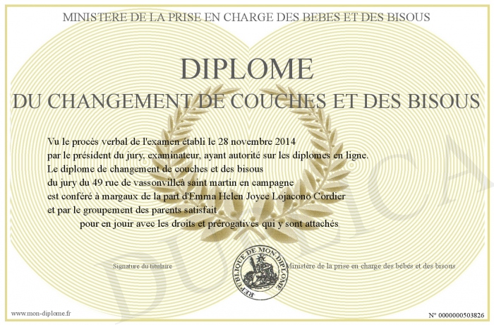 Envoyez par email votre Diplôme du changement de couches et des bisous personalisé