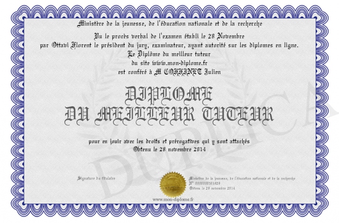 Envoyez par email votre DIPLOME DU MEILLEUR TUTEUR personalisé