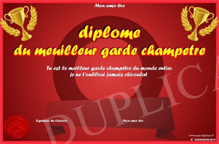 Envoyez par email votre diplome du meuilleur garde champetre personalisé