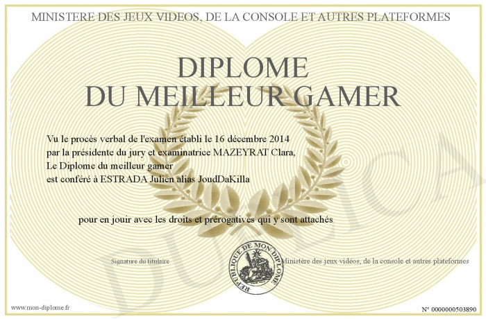 Envoyez par email votre Diplôme du meilleur gamer personalisé