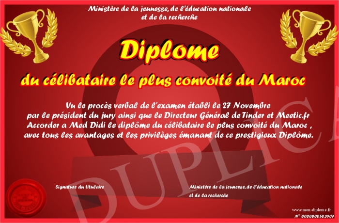 Envoyez par email votre Diplôme du célibataire le plus convoité du Maroc personalisé