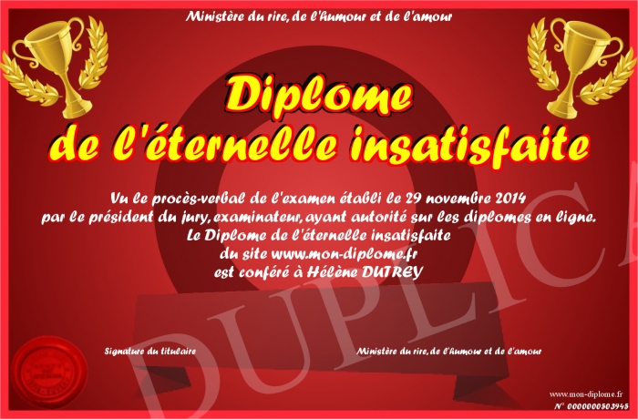 Envoyez par email votre Diplome de l'éternelle insatisfaite personalisé