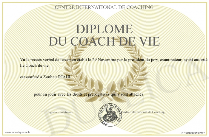 Envoyez par email votre Diplôme du Coach de vie personalisé