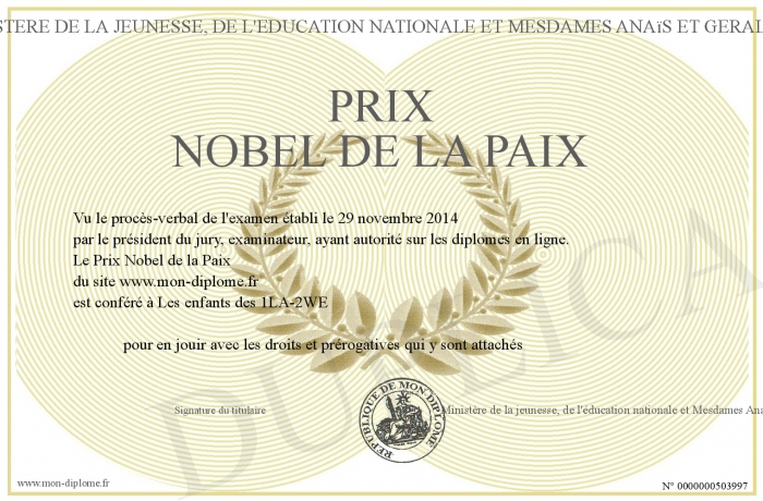 Envoyez par email votre Prix Nobel de la Paix personalisé