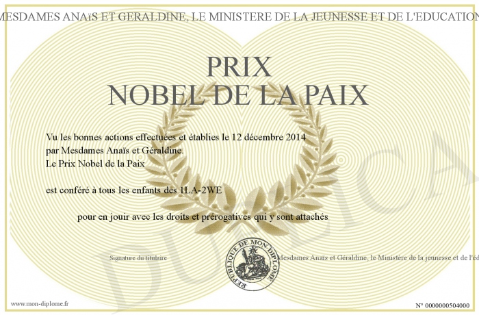 Envoyez par email votre Prix Nobel de la Paix personalisé
