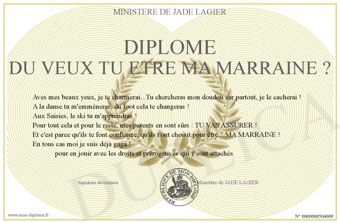 Envoyez par email votre Diplôme du VEUX TU ETRE MA MARRAINE ? personalisé
