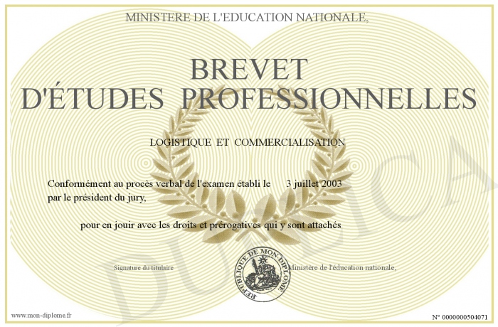Envoyez par email votre BREVET D'ÉTUDES PROFESSIONNELLES personalisé