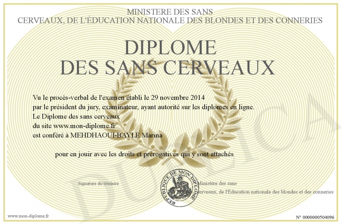 Envoyez par email votre Diplome des sans cerveaux personalisé