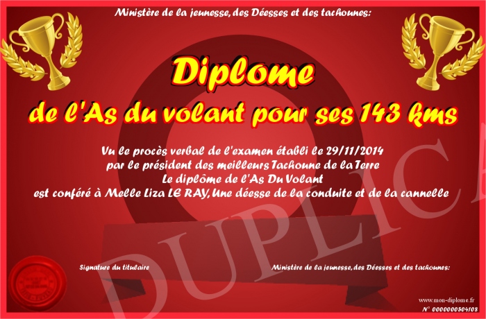 Envoyez par email votre Diplôme de l'As du volant pour ses 143 kms personalisé