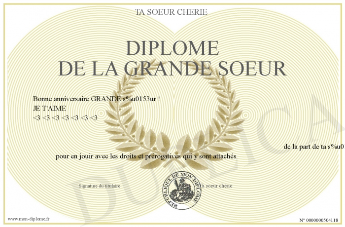 Envoyez par email votre Diplôme de la grande soeur personalisé