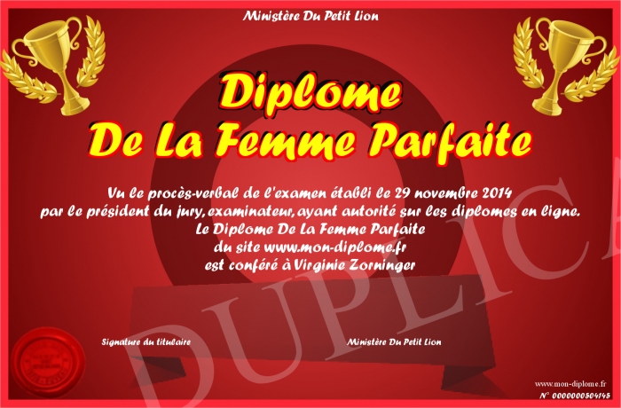 Envoyez par email votre Diplôme De La Femme Parfaite personalisé