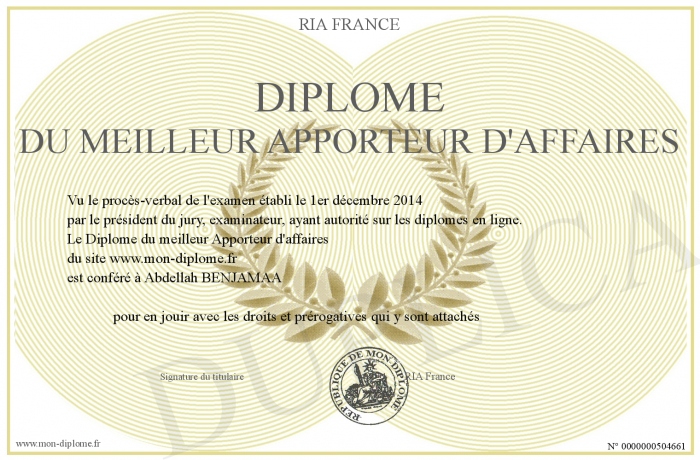 Envoyez par email votre Diplôme du meilleur Apporteur d'affaires personalisé