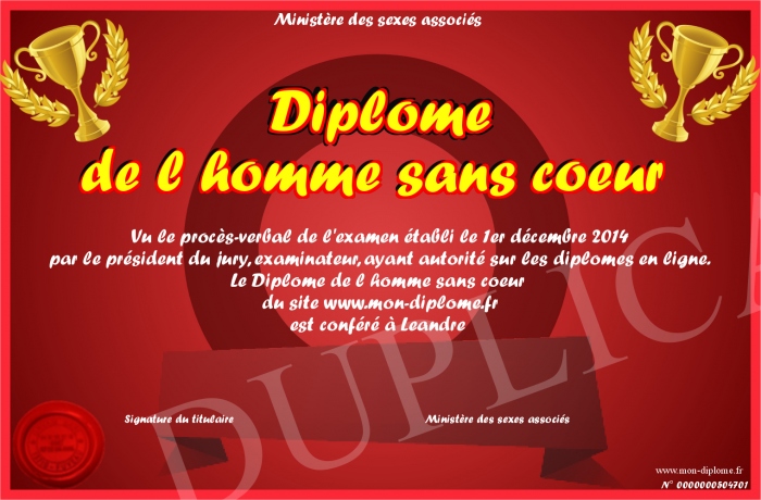 Envoyez par email votre Diplôme de l homme sans coeur personalisé
