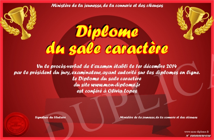 Envoyez par email votre Diplôme du sale caractère personalisé