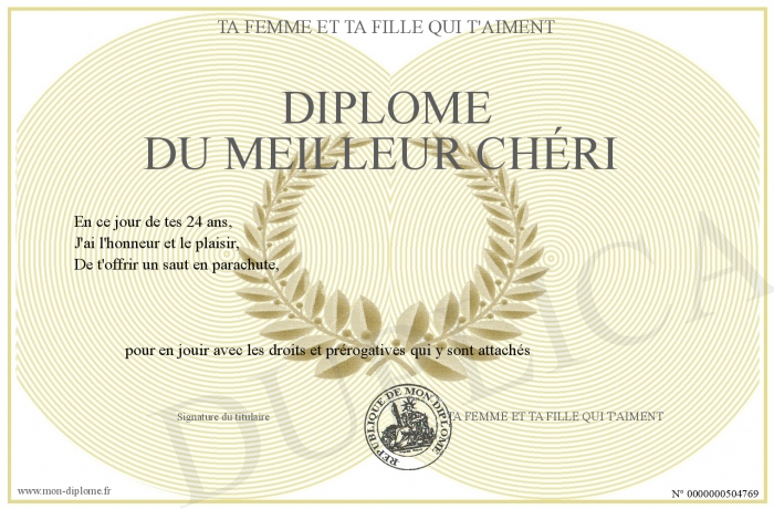 Envoyez par email votre Diplôme du MEILLEUR CHÉRI personalisé