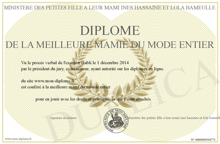 Envoyez par email votre Diplôme de la meilleure mamie du mode entier personalisé