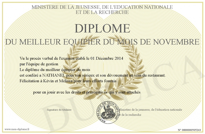 Envoyez par email votre Diplôme du meilleur équipier du mois de Novembre personalisé